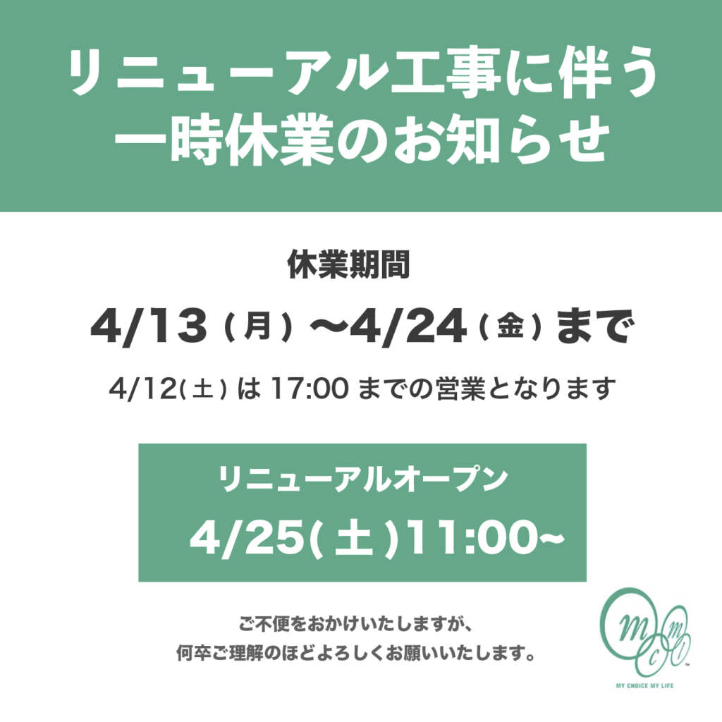 この度、店舗リニューアルに伴い、下記期間を休業とさせていただきます。